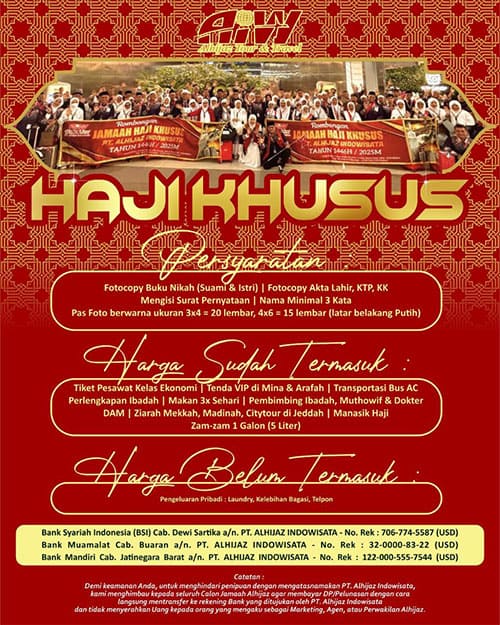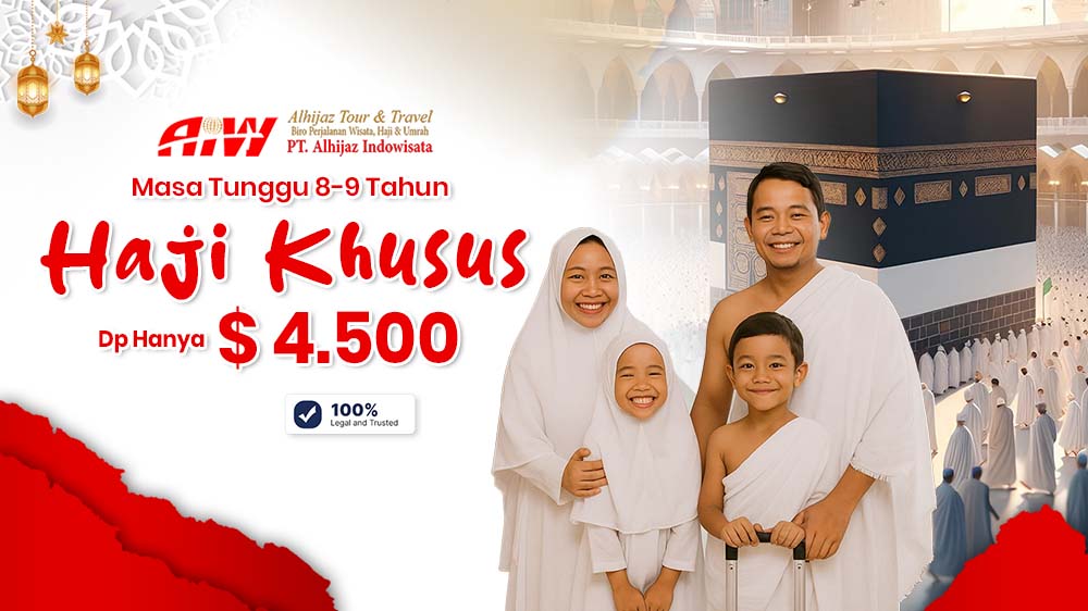 Alhijaz Indowisata adalah Travel Haji Plus atau Haji Plus terpercaya di Indonesia. Travel resmi Kementerian Agama RI AKREDITASI “A” dengan izin Umroh PPIU No.U490/2020 dan izin Haji PIHK No. KMA 304/2022. Adapun Syarat Pendaftaran Haji Khusus ialah :